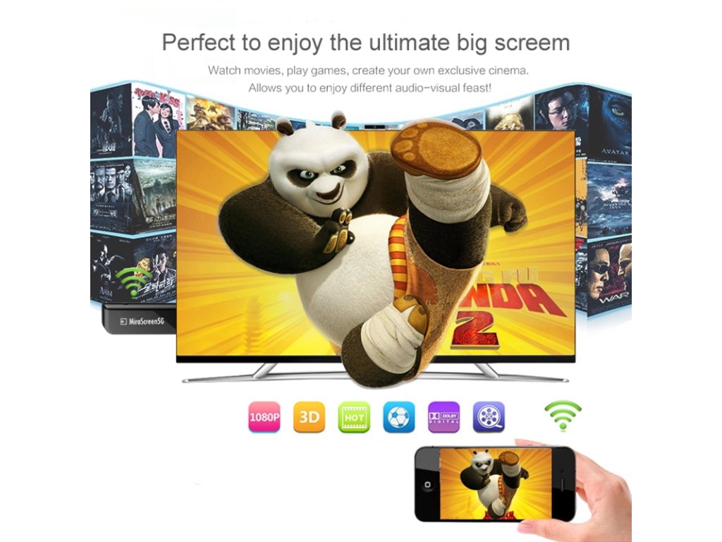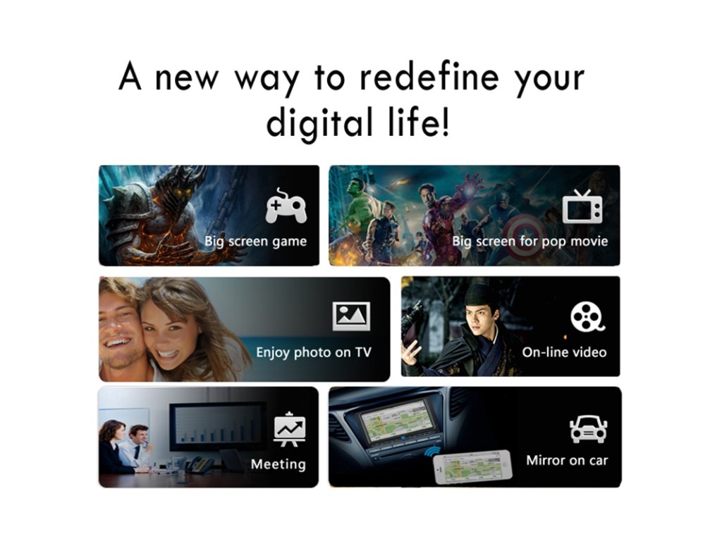- Přímé přehrávání videa, prohlížení fotek, nebo režimy zobrazení zrcadlení / rozšíření celé obrazovky stávajícího zařízení.