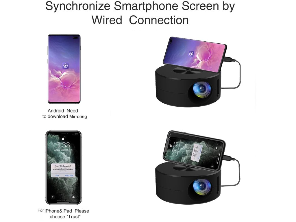 - Po připojení datového kabelu zrcadlí veškerý obraz + zvuk (např. Youtube) z iPhone, iPadu či Android zařízení.